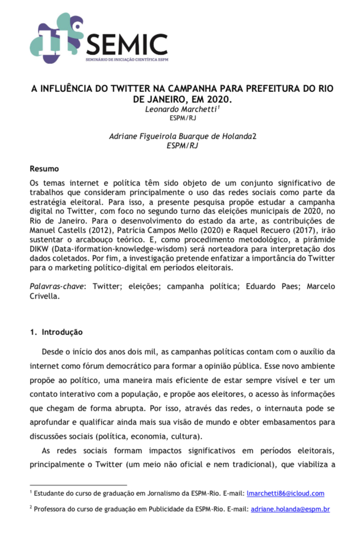 Durante 6 meses me debrucei em entender o papel do Twitter em campanhas eleitorais - especialmente na municipal do Rio de Janeiro, em 2020. A experiência com Iniciação Científica é enriquecedora e me trouxe um outro olhar para o mundo acadêmico.