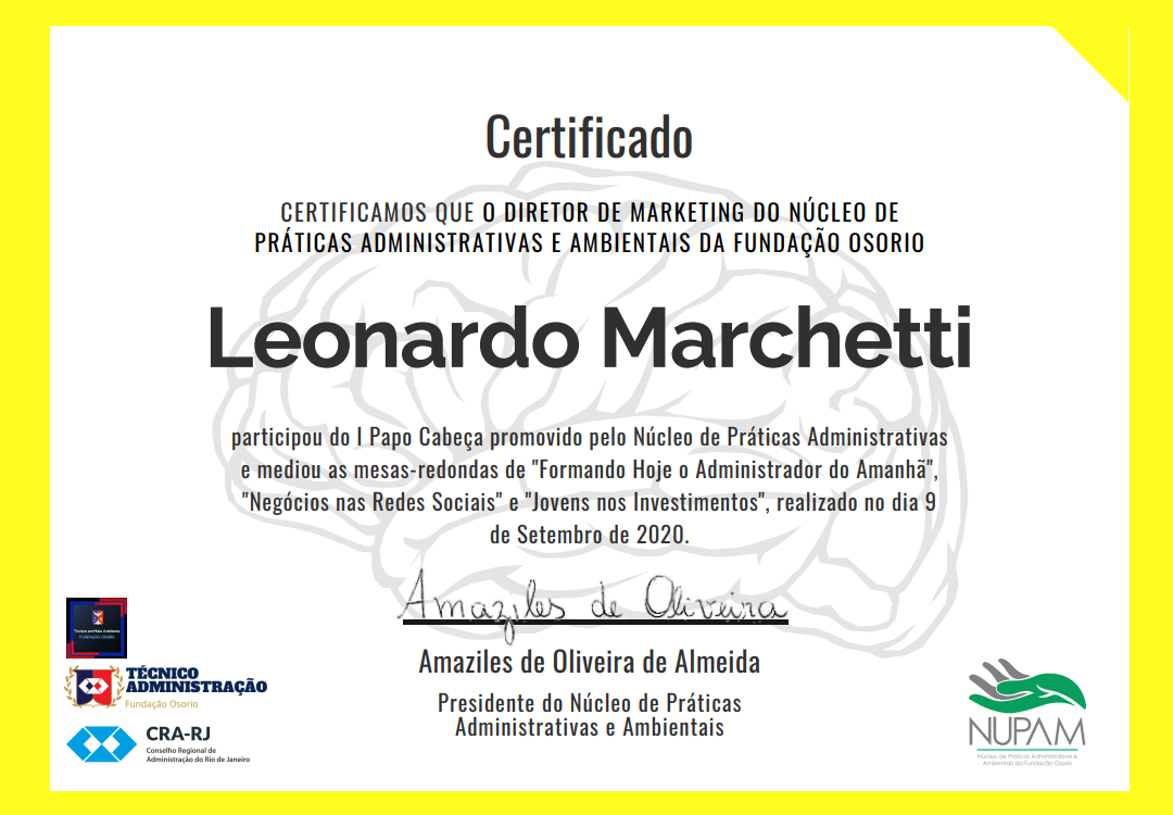 No meu Ensino Médio técnico em Administração, na Fundação Osório, atuei como Diretor de Marketing de uma empresa júnior. Ainda embrionária, o Núcleo de Práticas Administrativas e Ambientais (NUPAM) não tinha nenhum tipo de conteúdo ou objetivo traçado. Pensamos juntos e durante 1 ano conseguimos promover eventos online, planejar redes sociais e debater sobre o ofício da Administração.
